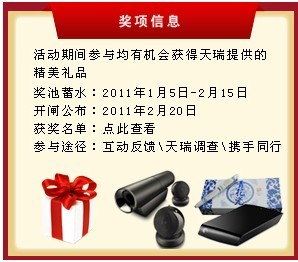 为了方便广大客户对天瑞2010年的成绩有个系统性的认识和更加直观的了解,在客户关怀月中重点推出 “天瑞仪器2010年度回顾”活动。专题下设六大板块,诸多精彩,尽在其中。更有年度调查,邀您参与赢大礼。