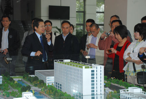 天瑞仪器产业园沙盘前,刘召贵博士介绍企业情况