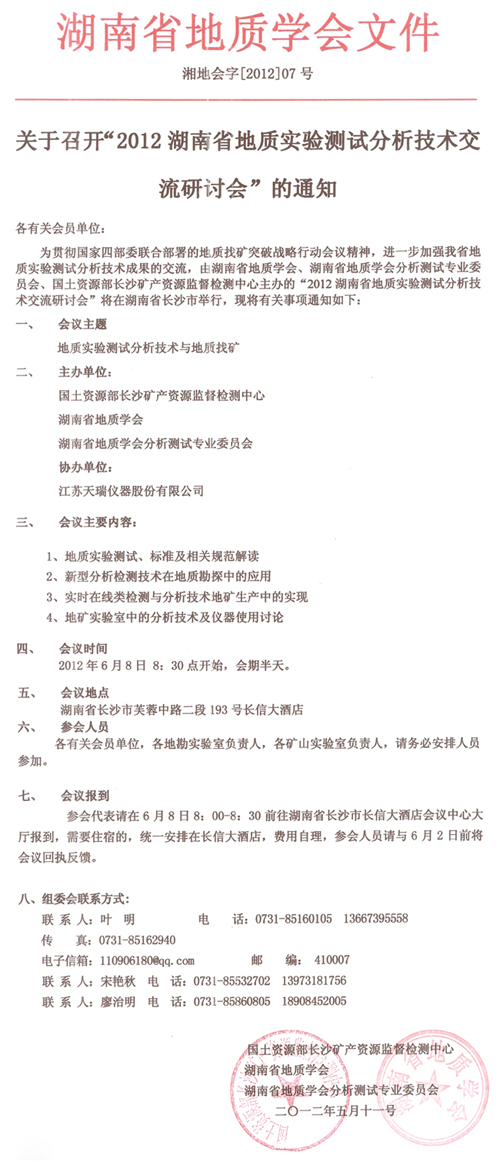 6月8日,由湖南省地质学会、湖南省地质学会分析测试专业委员会、国土资源部长沙矿产资源监督检测中心联合主办的“2012湖南省地质实验测试分析技术交流研讨会”将在湖南长沙举行。天瑞仪器作为协办单位,将出席会议,并作报告。