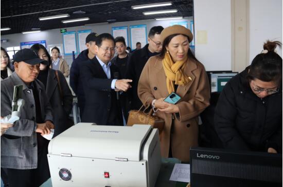 随后,考察团一行深入生产车间。在生产测试区,专家们表现出了浓厚的兴趣,重点考察了天瑞仪器的EDX-T镀层测厚仪和EDX3000PLUS X荧光贵金属检测仪。刘博士现场为考察团演示了设备操作,并详细讲解了这两款仪器的技术优势与应用场景。成都表面工程协会考察团一行对天瑞仪器的技术实力和产品性能给予了高度认可。