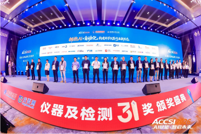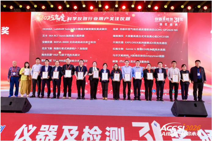 2026年4月22-24日,以“AI赋能・智启未来”为主题的第十九届中国科学仪器发展年会(ACCSI 2026)在北京朗丽兹西山花园酒店隆重举行。作为我国科学仪器领域最具影响力的年度盛会之一,本届年会吸引了超过1800位科学仪器行业相关政府领导、院士专家、仪器企业CEO、检测机构负责人、投资人等参会,深度探讨前沿技术、产业升级与融合发展。作为国产科学仪器领军企业,江苏天瑞仪器股份有限公司(股票代码:300165)凭借卓越的技术创新实力、广泛的市场影响力及优质的用户口碑,一举斩获“2025年度科学仪器行业领军企业”“2025年度用户关注优选奖”“2025年度好仪器奖”三项重磅荣誉,同时作为品牌合作伙伴参与联合宣言,以实际行动助推国产仪器高质量发展。